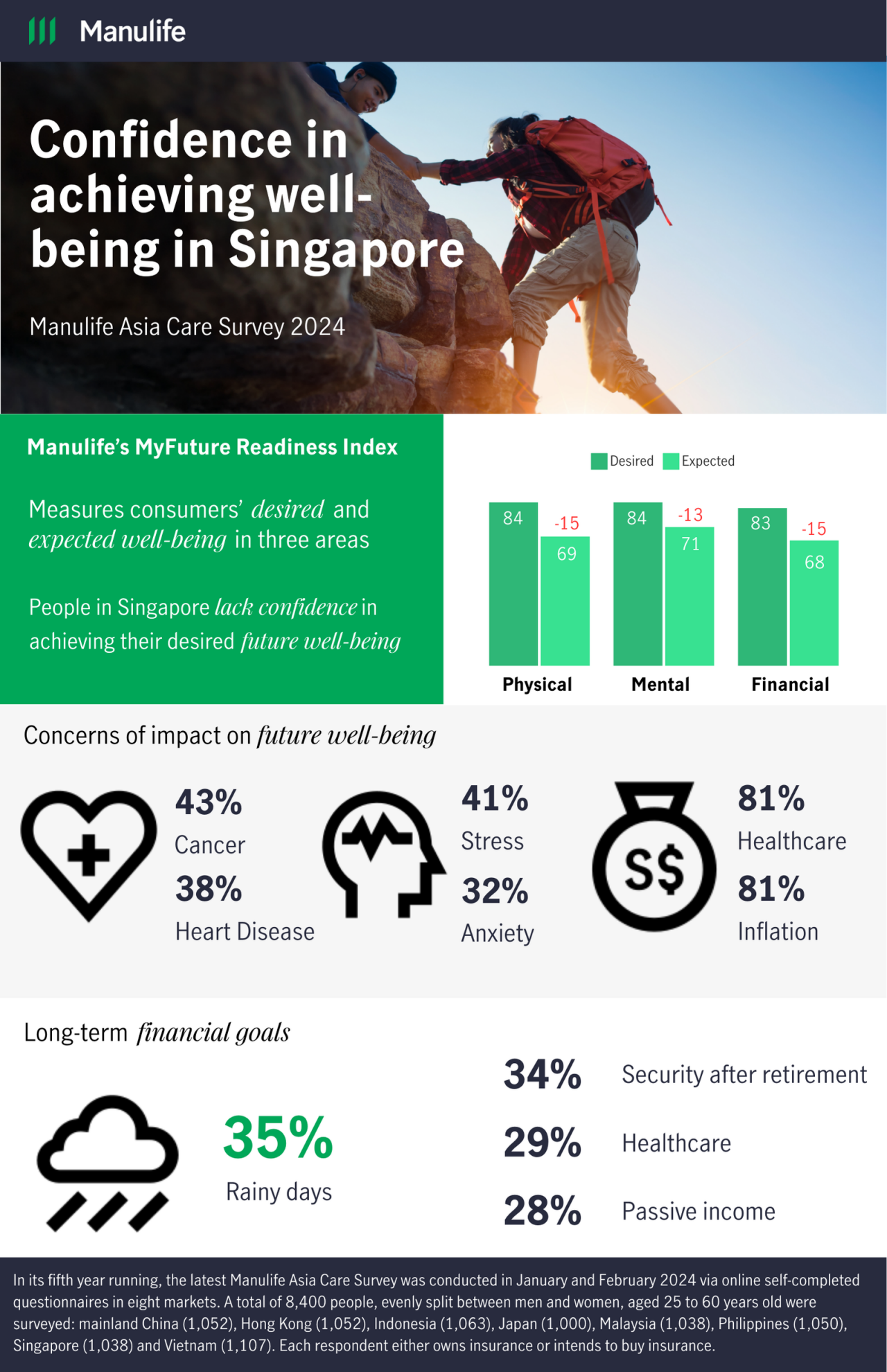 The survey also revealed significant gaps in wellbeing goals and financial confidence among Singapore consumers, highlighting deep-rooted concerns over economic and healthcare uncertainties across all age groups. This year's findings indicate a pronounced 14-point gap in the Manulife MyFuture Readiness Index, with the average wellbeing score at 69, compared to a higher aspirational level of 83 over the next decade.
